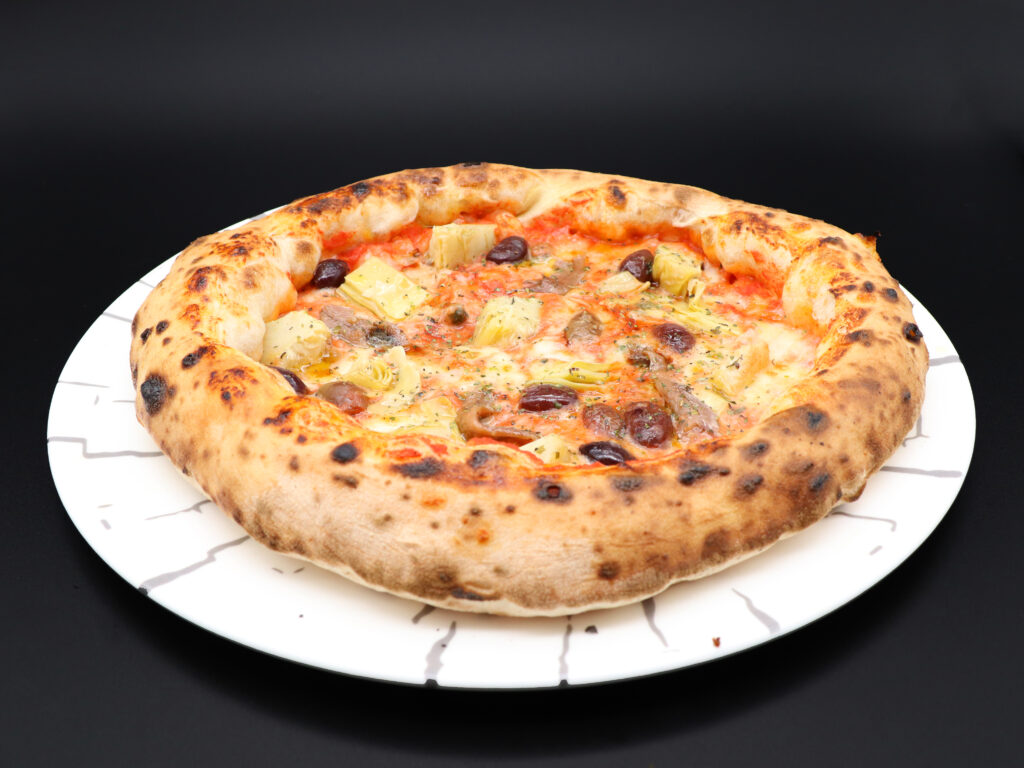 Pomodoro San Marzano, fiordilatte, carciofi Paestum, funghi, capperi, filetti di alici Cetara, olive, prosciutto cotto, olio Evo, origano