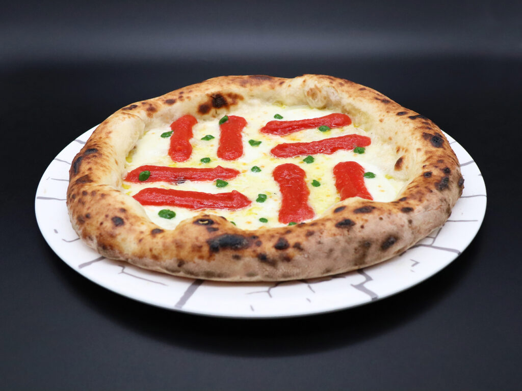 Mozzarella di bufala campana DOP, ricotta di bufala campana DOP, scamorza, salsiccia stagionata di suino casertano, pepe nero, macchiato di pomodoro San Marzano, olio Evo