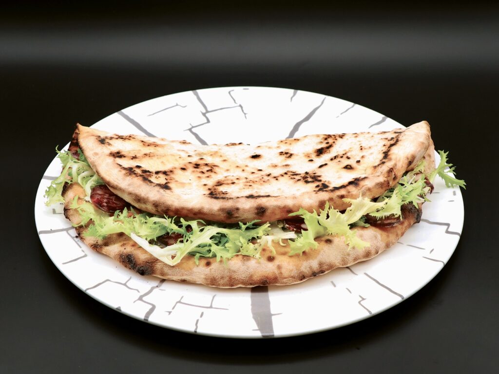 Fiordilatte, salsiccia secca di razza casertana, scamorza affumicata, origano, olio evo, scarola riccia