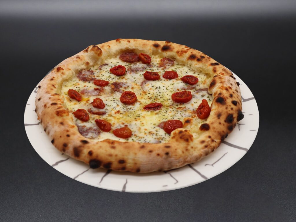 Pomodoro San Marzano, fiordilatte, scamorza affumicata, salsiccia stagionata di suino casertano, origano, olio evo